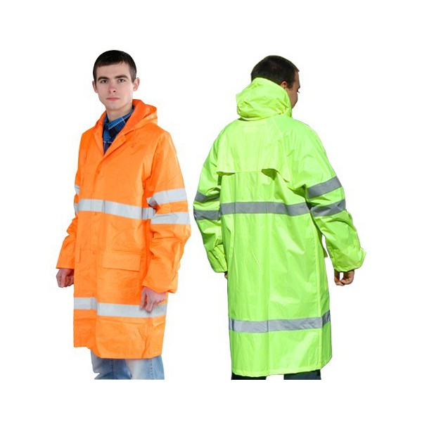 Weiche, nicht einschränkende Regenjacke mit reflektierenden Streifen.Hergestellt aus beidseitig mit PVC beschichtetem Polyester. Verpackt in einem kleinen Beutel. Die Jacke ist verlängert, hat eine wasserdichte Kapuze, die im Kragen versteckt werden kann.