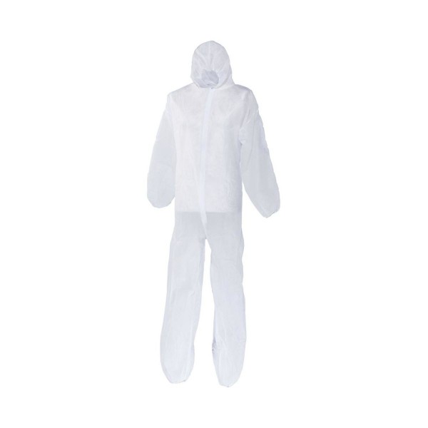 Einweganzug mit Kapuze, Länge bis zu den Knöcheln, mit einem eingenähten Gummiband in den Manschetten, Rücken und Knöcheln. Reißverschluss an der Vorderseite.
