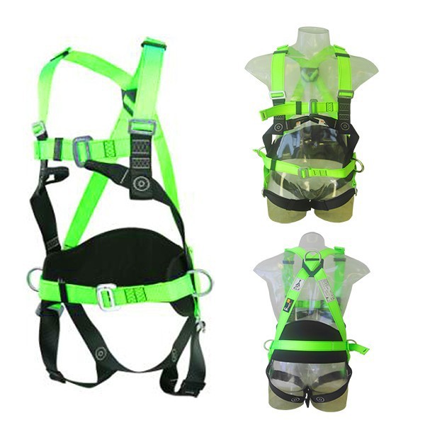 An den Hüftgurtschlaufen und zwei Karabiner zum Aufhängen von Werkzeugen.