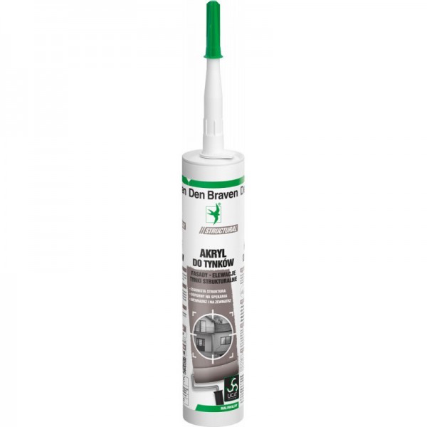 DEN BRAVEN Acryl für Putze ist ein hochplastischer und elastischer Dichtungsspachtel auf Basis einer wässrigen Acryldispersion mit Kiespartikeln, zum Füllen von Rissen, Fugen und Spalten in Struktur-, Mosaik- oder Rauputzen, im Innen- und Außenbereich