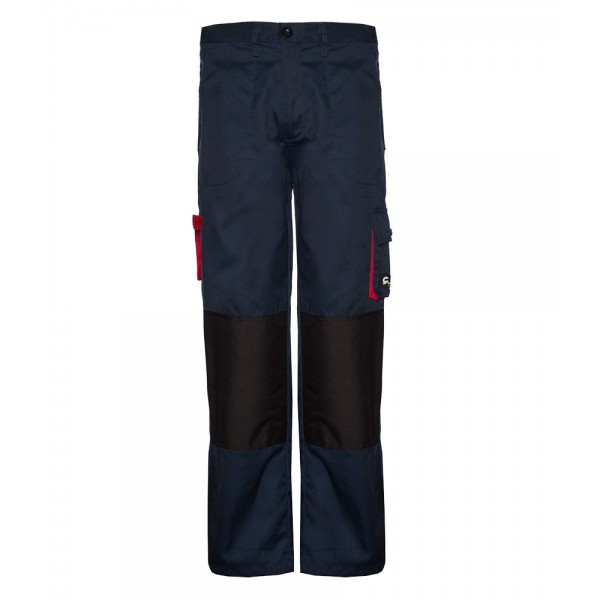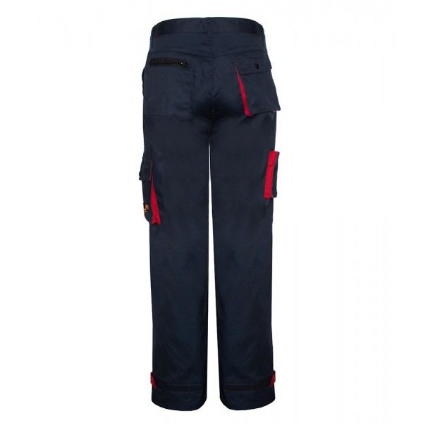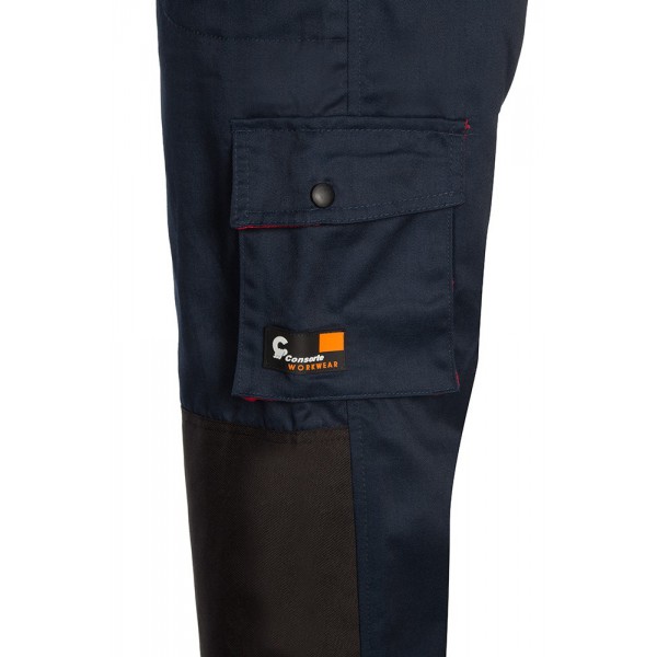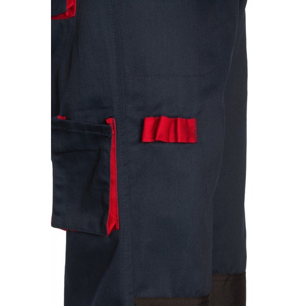Untertaschen: auf der linken Beinseite mit einer mit einem Druckknopf befestigten Klappe vernäht, auf der rechten Beinseite auf kleinen Werkzeugen genäht
