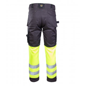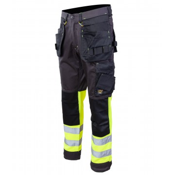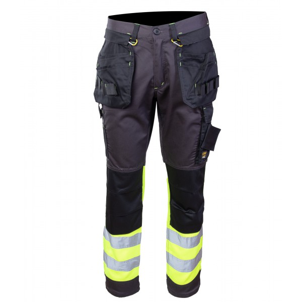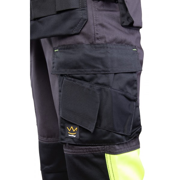 Fluoreszierend mit Blendung. Polyester wird aus recycelten Rohstoffen hergestellt. Wasserdichtes Finish. Zweifarbig. Geringes Gewicht. Extrem flexibel, extrem leicht und abriebfest. Doppelte Nähte in den Beinen und im Schritt. Versteckter Druckknopfverschluss. Beine in ergonomischer Form. Gürtelschlaufen. Federbein mit Reißverschluss. Fronttaschen. Verstärkte Gesäßtaschen. Versteckte Hammerschlaufe auf der rechten Seite. Zolltasche mit Kevlar-Verstärkungen®. Taschen mit Patten an der Vorderseite der Oberschenkel. Die Knietaschen aus strapazierfähigem CORDURA-Material® (1000 D) sind verstellbar. Oberschenkeltasche mit Telefontasche (mit Futter), verstecktem Druckknopfverschluss und integriertem ID-Halter.